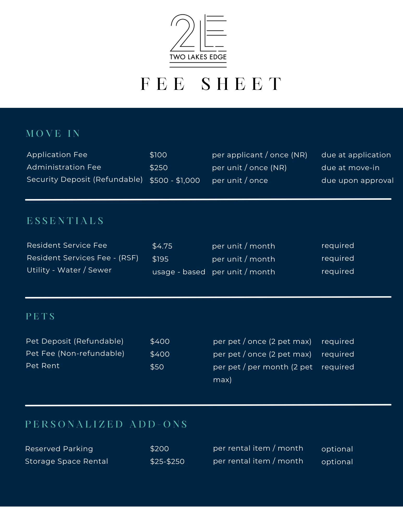 To make things simple and clear, we have put together a list of potential fees you might encounter as a current or future resident. This way, you can easily see what your initial and monthly costs might be in addition to base rent.